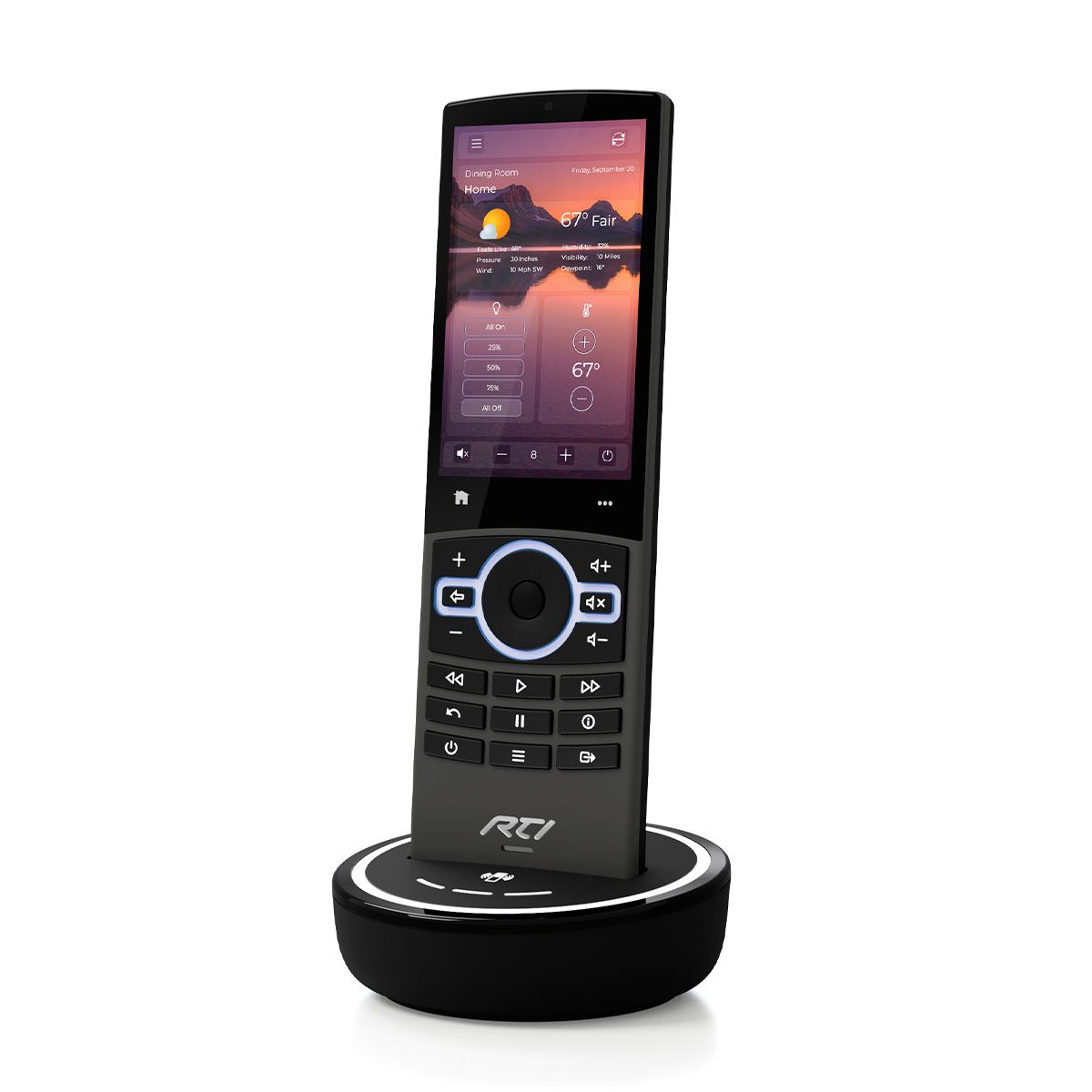Equipped with three programmable soft-touch buttons, it’s ideal for easy control of custom scenes or frequently used room functions—without even lifting the remote off the base.